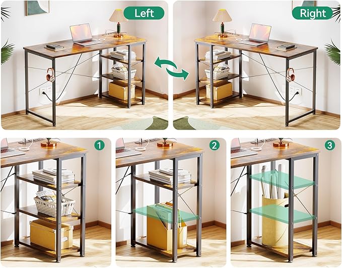 AODK Laptop Desk Office Desk, 48 Inch Computer Desk with Power Outlet and USB & Type-C Charging Port, Writing Desk with 3-Tier Reversible Storage Shelf for Home Office, 48'' x 16'', Rustic Brown