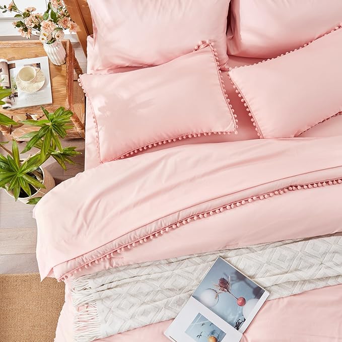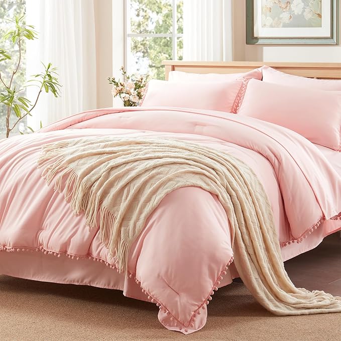Anluoer King Comforter Set 7 Piece, Pink Bed in a Bag with Sheets, Pom Pom Boho Bedding Comforter Sets with 1 Comforter, 2 Pillow Shams, 2 Pillowcases, 1 Flat Sheet, 1 Fitted Sheet