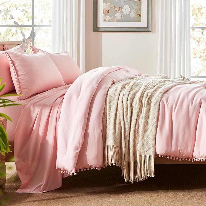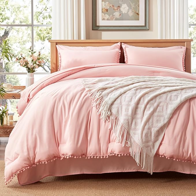 Anluoer Queen Comforter Set 7 Piece, Pink Bed in a Bag with Sheets, Pom Pom Boho Bedding Comforter Sets with 1 Comforter, 2 Pillow Shams, 2 Pillowcases, 1 Flat Sheet, 1 Fitted Sheet