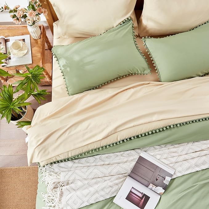 Anluoer Full Comforter Set 7 Piece, Sage Green Bed in a Bag with Sheets, Pom Pom Boho Bedding Comforter Sets with 1 Comforter, 2 Pillow Shams, 2 Pillowcases, 1 Flat Sheet, 1 Fitted Sheet