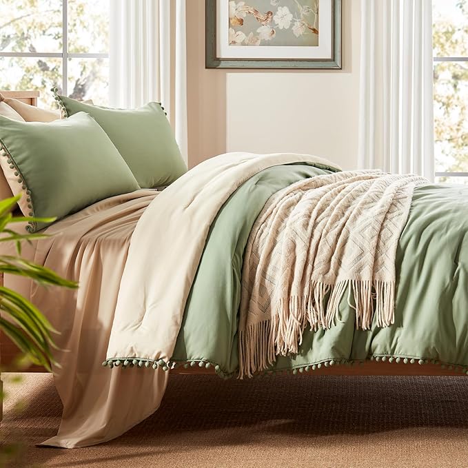 Anluoer King Comforter Set 7 Piece, Sage Green Bed in a Bag with Sheets, Pom Pom Boho Bedding Comforter Sets with 1 Comforter, 2 Pillow Shams, 2 Pillowcases, 1 Flat Sheet, 1 Fitted Sheet