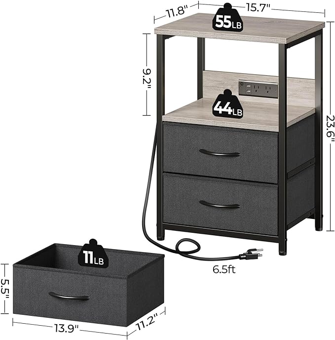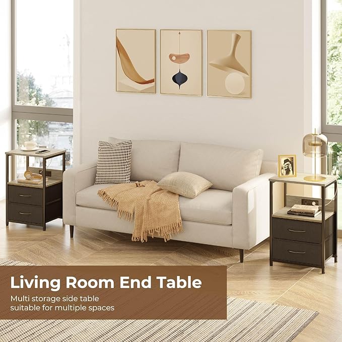 Seventable Nightstand set of 2 with Charging Station, Bedside table with LED Lights, Night stand with 2 Fabric Drawers, 3-Tier Storage End Table for Bedroom, Greige