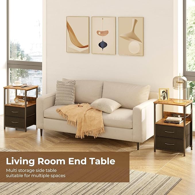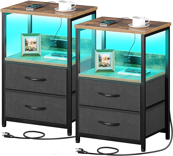 Seventable Nightstand set of 2 with Charging Station, Bedside table with LED Lights, Night stand with 2 Fabric Drawers, 3-Tier Storage End Table for Bedroom, Rustic Brown