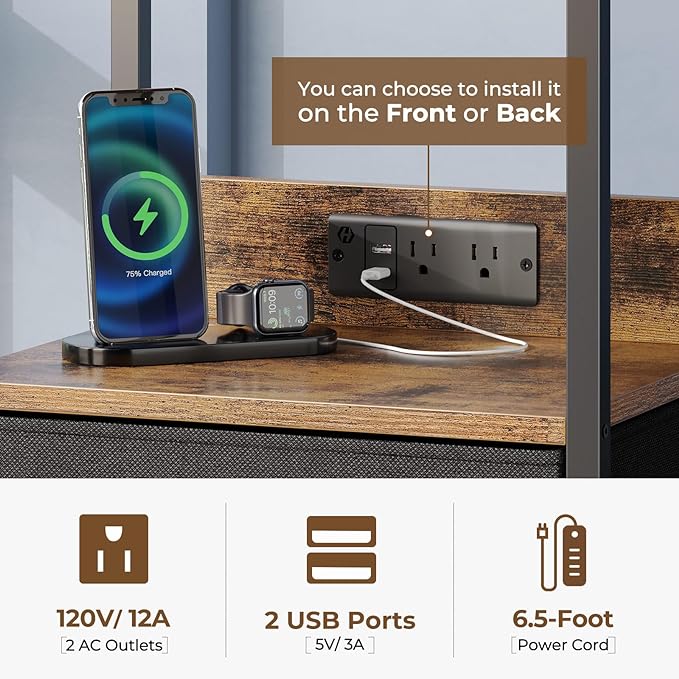 Seventable Nightstand with Charging Station, Bedside table with LED Lights, Night stand with 2 Fabric Drawers, 3-Tier Storage End Table for Bedroom, Rustic Brown