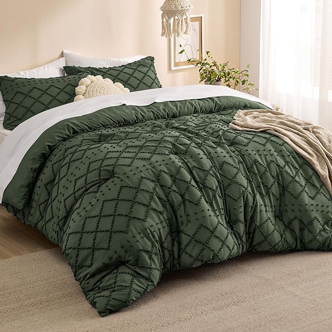Bedsure Full Size Comforter Set - Olive Green Comforter, Boho Tufted Shabby Chic Bedding Comforter Set, 3 Pieces Farmhouse Bed Set for All Seasons, Fluffy Soft Bedding Set with 2 Pillow Shams