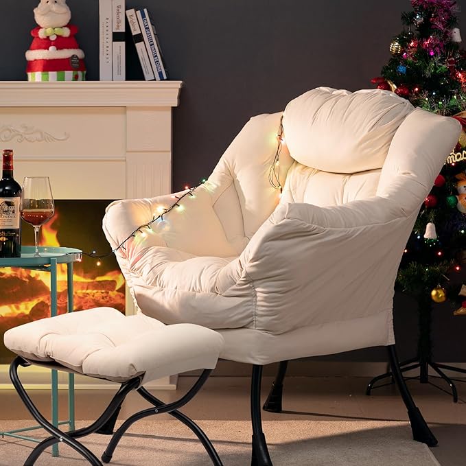 AcozyHom Modern Fabric Lazy Chair and Folding Footrest Stool Set, Accent Contemporary Lounge Chair and Portable Ottoman, Steel Frame Leisure Sofa Chair and Metal Cotton Anti-Slip Footstool, Beige