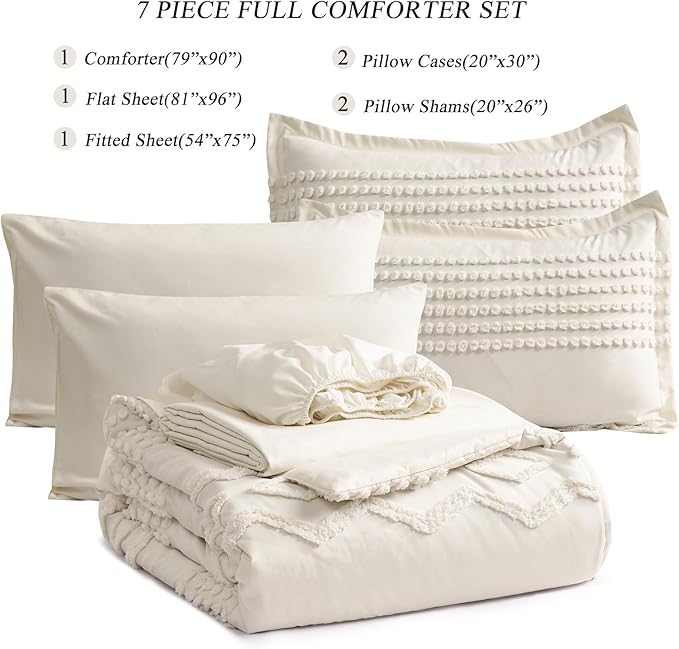 KAKIJUMN White Tufted Comforter Set Full Size 7 Piece Bed in a Bag, Shabby Chic Boho Comforter and Sheet Set, Pom Pom Textured Bed Set, All Season Soft Microfiber Complete Bedding Set(White,Full)