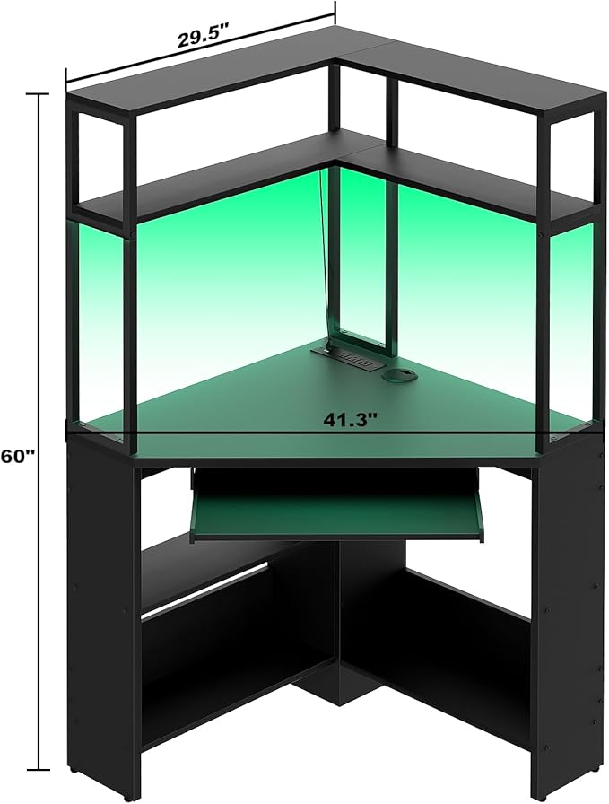 Cyclysio Small Corner Desk with Hutch, Heavy Duty Corner Computer Desk with Power Outlets & LED Light, Triangle Corner Gaming Desk with Keyboard Tray for Home Office, Small Space, Workstation Black