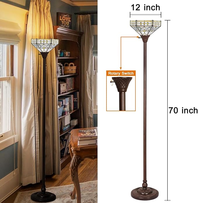 About This Tiffany floor lamp Size: lamp shade 12 inches wide and lamp post 70 inches Height;product total weight is...