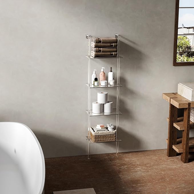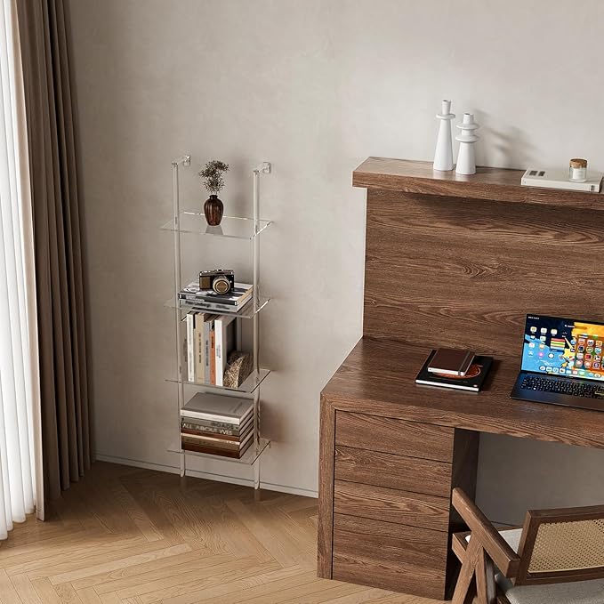 Small Acrylic Ladder Bookshelf, 9.5" D x 15.6" W, 4-Tier Clear Wall Mounted Book Shelf for Small Spaces, Multipurpose Bookcase for Living Room, Bathroom, Office, Modern, 59" H