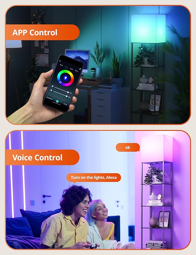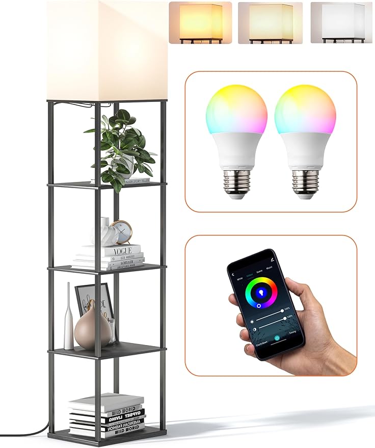 sympa Floor Lamp with Shelves, 5-Tier Floor Lamps for Living Room with 2 RGB Bulbs, APP Controlled, Pull Chain Switch, Modern Floor Lamp with White lampshade for Living Room, Bedroom and Office