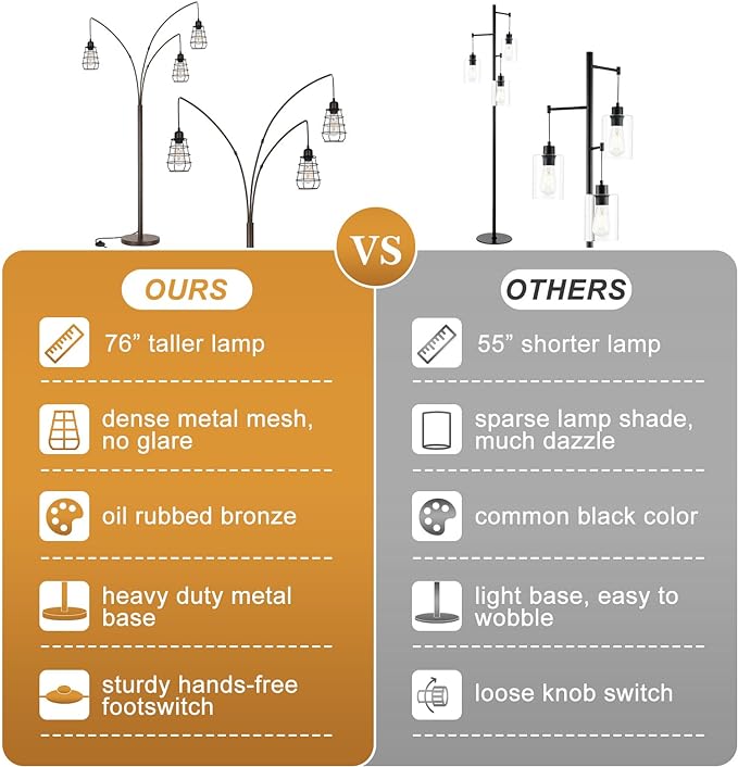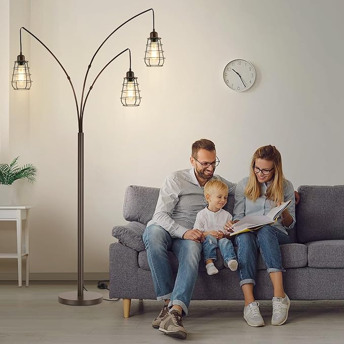 Industrial Floor Lamp, 3 Light Arc Floor Lamps for Living Room, 76 Inch Tall Standing Lamp with Metal Cage Shades & Foot Switch, Vintage Floor Lamp for Bedroom, Office, Corner, Bronze
