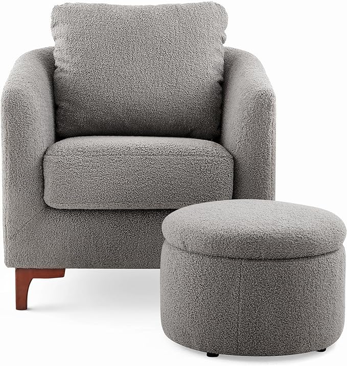 COLAMY Sherpa Accent Chair with Storage Ottoman Set, Upholstered Barrel Arm Chair with Footrest, Modern Living Room Chair with Back Pillow, Grey