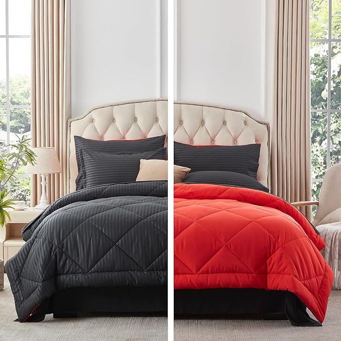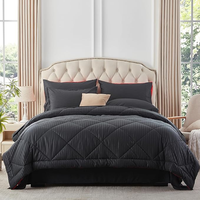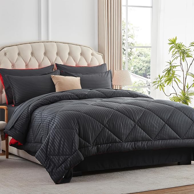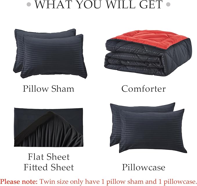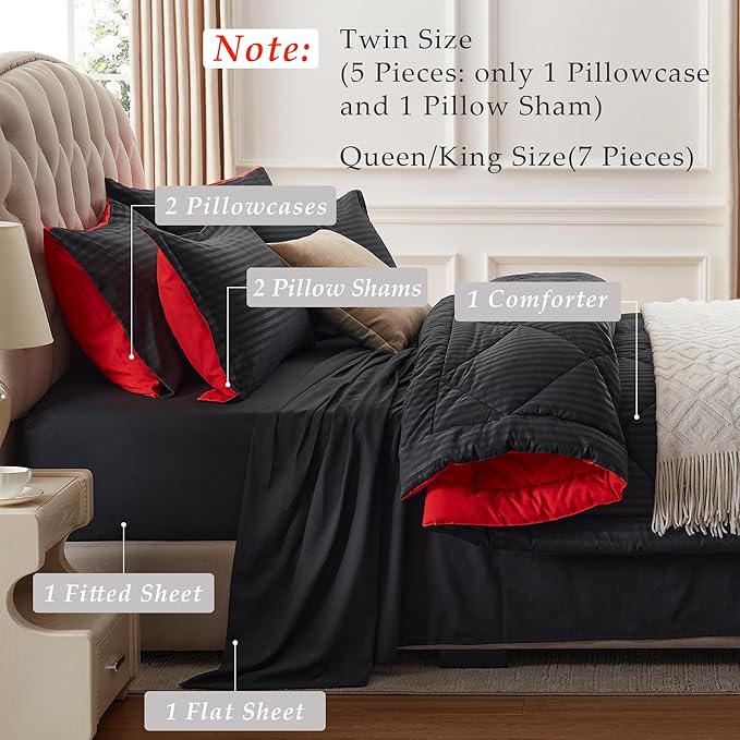 NexHome Black/Red King Bed in a Bag 7-Pieces Comforter Sets with Comforter and Sheets Soft All Season Bedding Sets with Comforter, Pillow Shams, Flat Sheet, Fitted Sheet and Pillowcases
