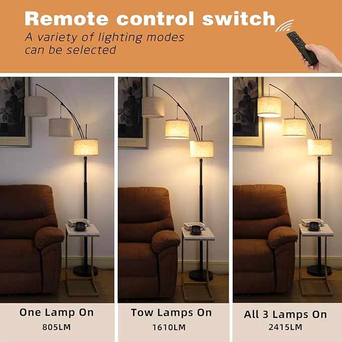 Arc Floor Lamp for Living Room with Remote Control, Dimmable Modern Mid Century 3 Lights Arched Tall Floor Lamp, Adjustable Standing Corner Lamp for Living Room Bedroom Office, Beige Lampshad (Black)