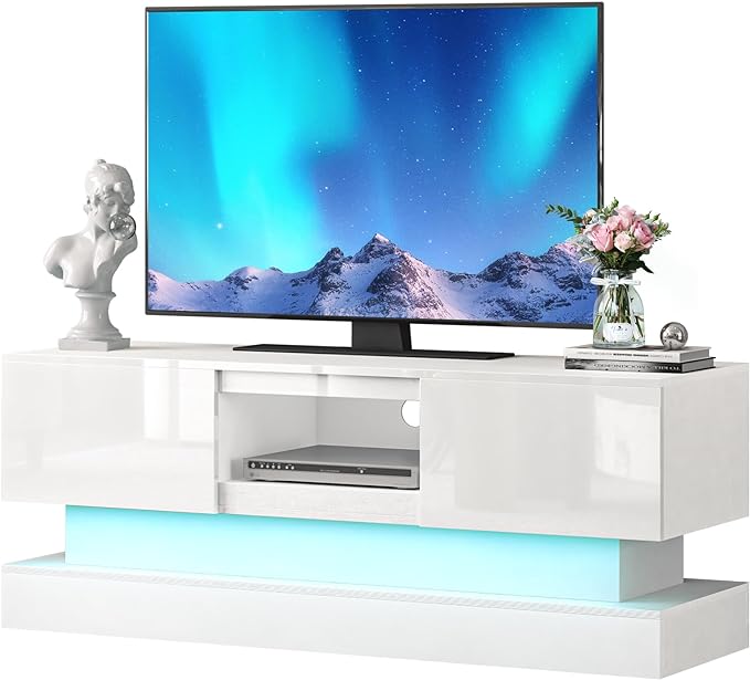 White TV Stand Modern - TV Stands with Led Lights and Storage Drawers for TVs up to 55 Inch - Gaming TV Entertainment Stand for Living Room, Bedroom
