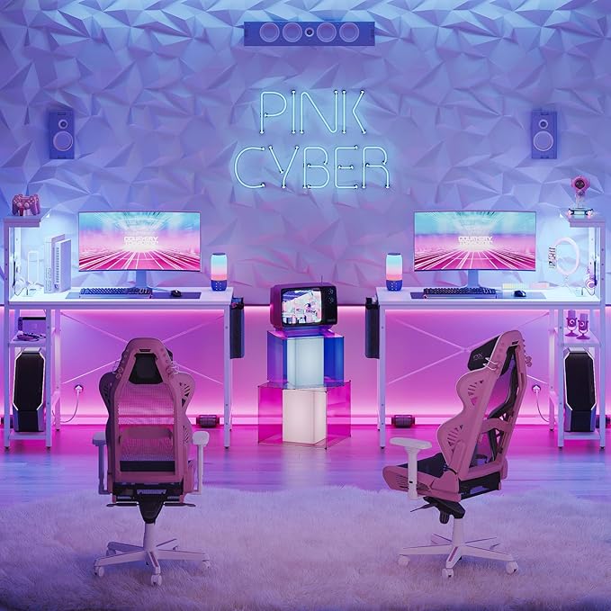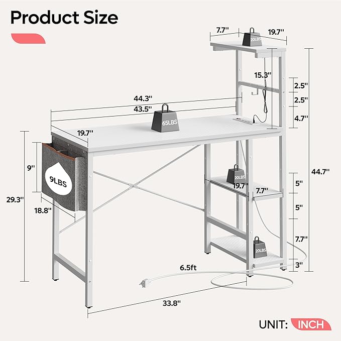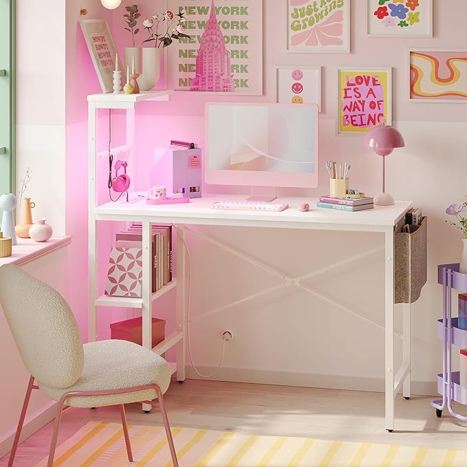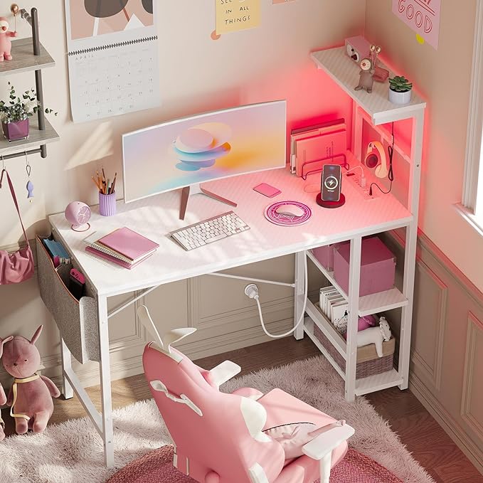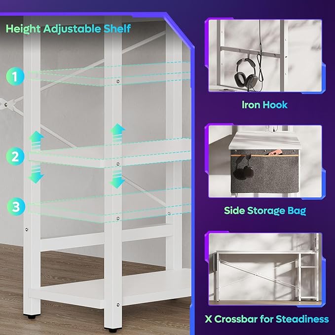 Bestier Gaming Desk with Power Outlets, 44 Inch Led Gamer Desk with 4 Tiers Reversible Shelves, PC Gaming Table with Headset Hook & Side Storage Bag for Bedroom (White 3D Carbon Fiber)