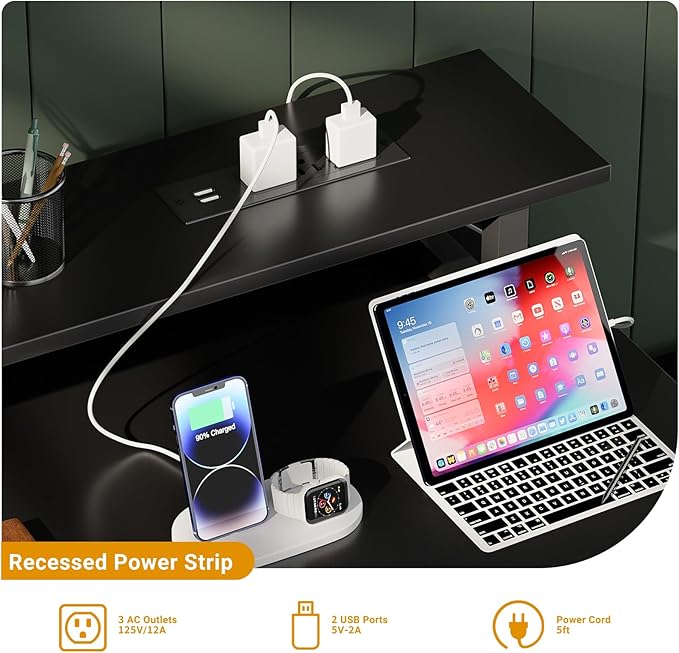 About This 【Desk with Power Outlets & Monitor Stand】This computer desk is equipped with ith a built-in power strip with...