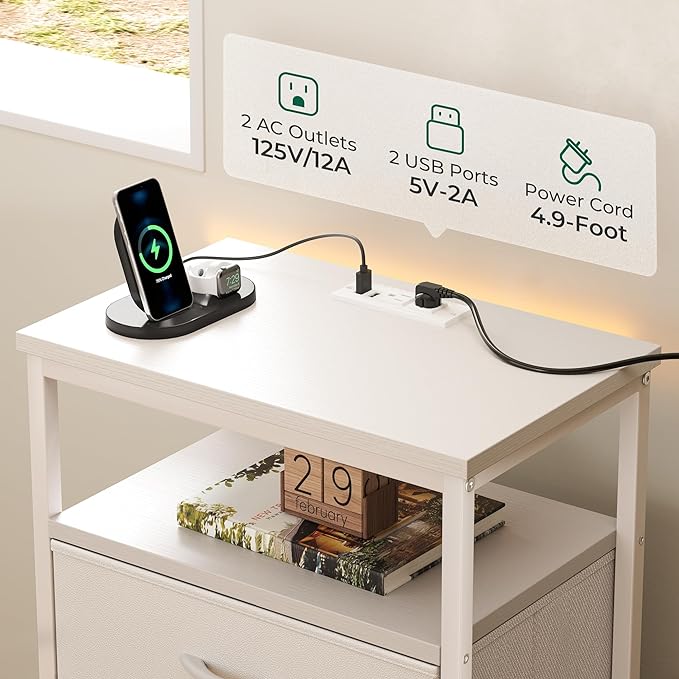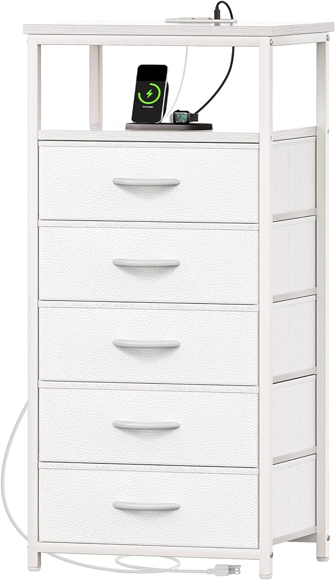 5 Drawers Dresser with Charging Station, Dresser for Bedroom, Tall Night Stand, Chest of Drawers with PU Leather Finish, Open Shelf, Bedside Table Nightstand, for Entryway, White