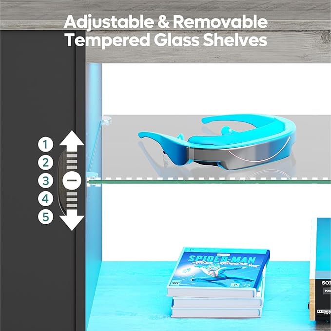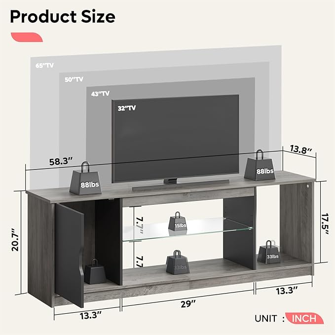 Bestier LED TV Stand for 55/60/65 Inch TV, Gaming Entertainment Center with Cabinet for PS5, Modern TV Cabinet with Adjustable Glass Shelves for Living Room, Bedroom 58 Inch, Grey Wash