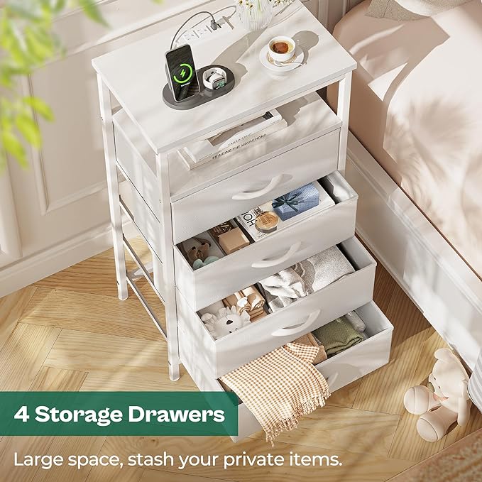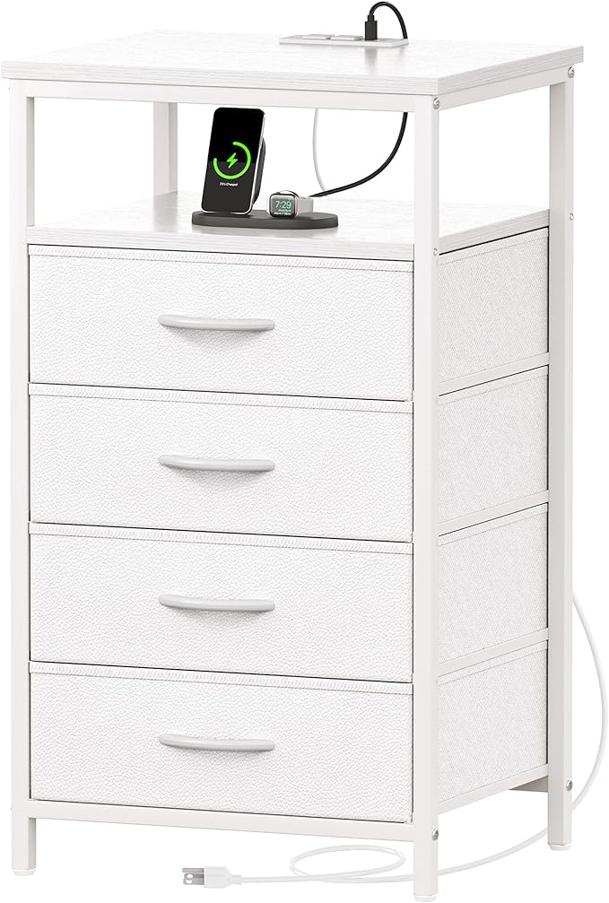 Night Stand with Charging Station, Multiple Drawer Dresser for Bedroom, Bedside Table, Tall Nightstand with PU Leather Finish, Open Shelf, End Table, for Closet, Entryway, Bedroom, White
