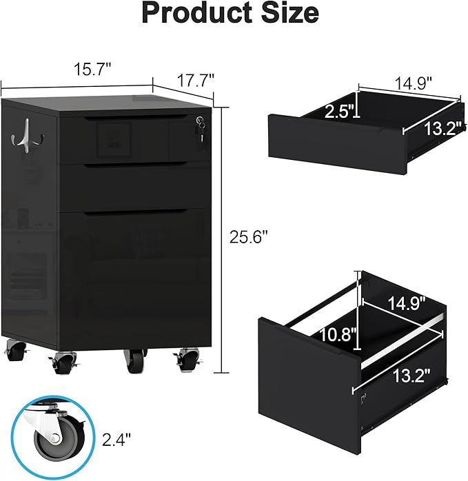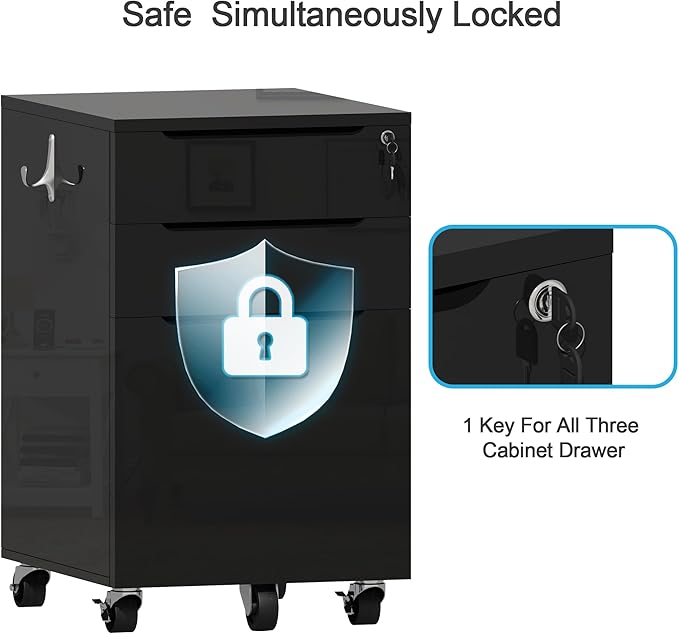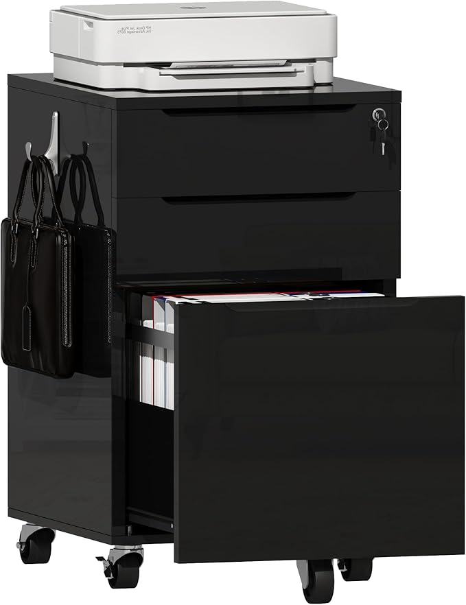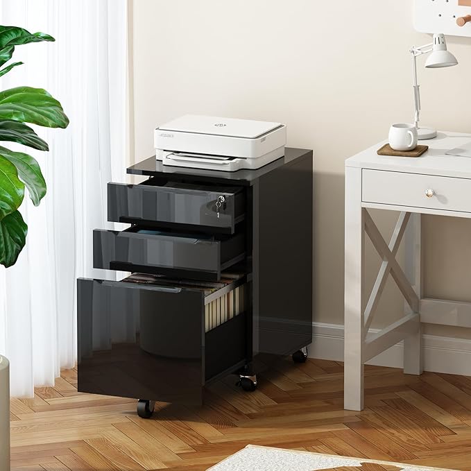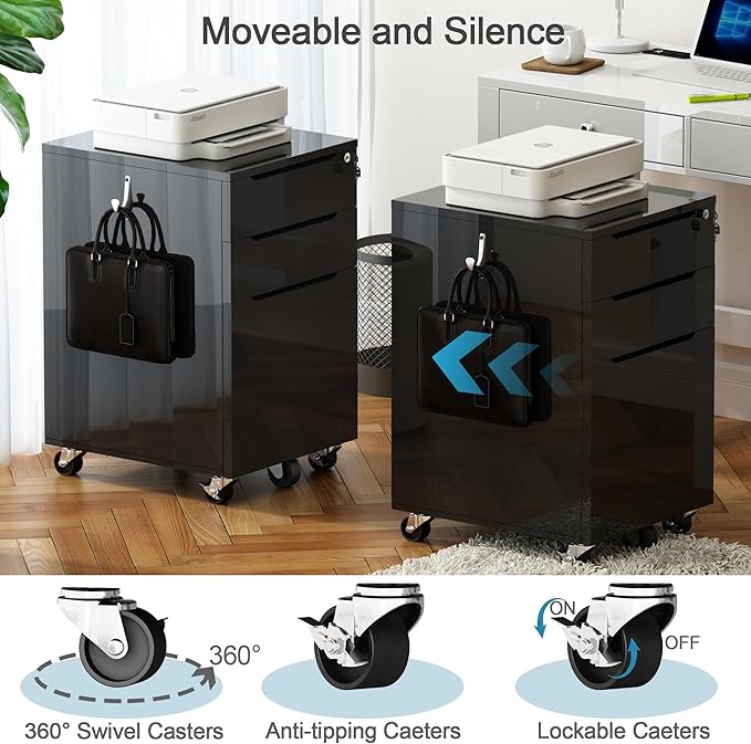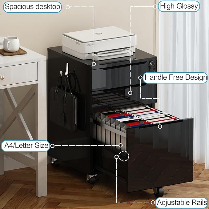 ChooChoo High Glossy File Cabinet with Lock,3 Drawer Rolling Filing Cabinet Fits Legal Size/A4/Letter, Under Desk File Cabinet with Hook for Home Office, Black