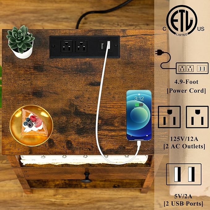 About This [Charge Multiple Devices with Ease] Our retro wood bedside tables is equipped with 2 outlets and 2 USB...