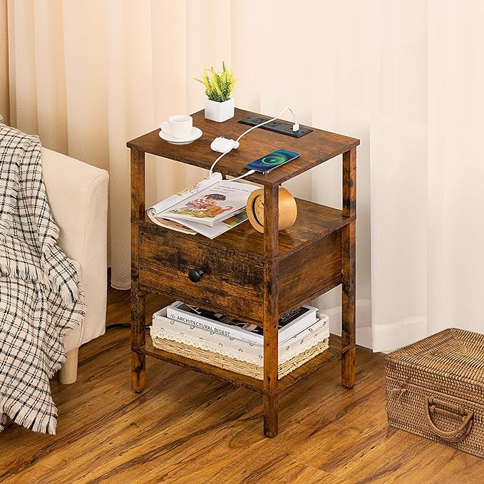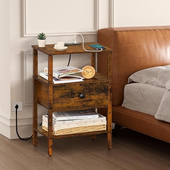 Lerliuo Nightstand Set of 2 with Charging Station and USB Ports, 3-Tier Storage End Table with Drawer Shelf, Night Stand for Small Spaces, Wood Bedside Table for Living Room, Bedroom-Brown