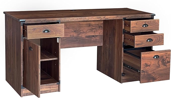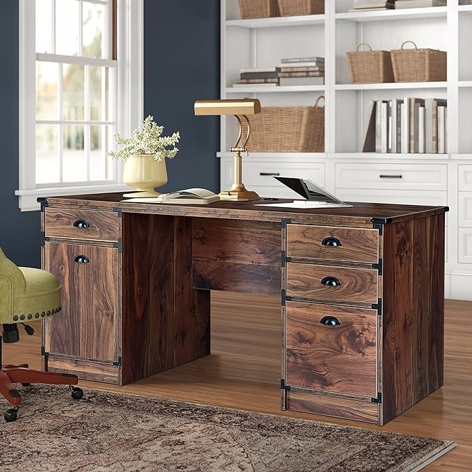 Modern Executive Desk, 59" Vintage Farmhouse Study Writing Desk with Storage Drawers, Industrial Wood Computer Manager's Desk with Knee Space for Home Office, Walnut