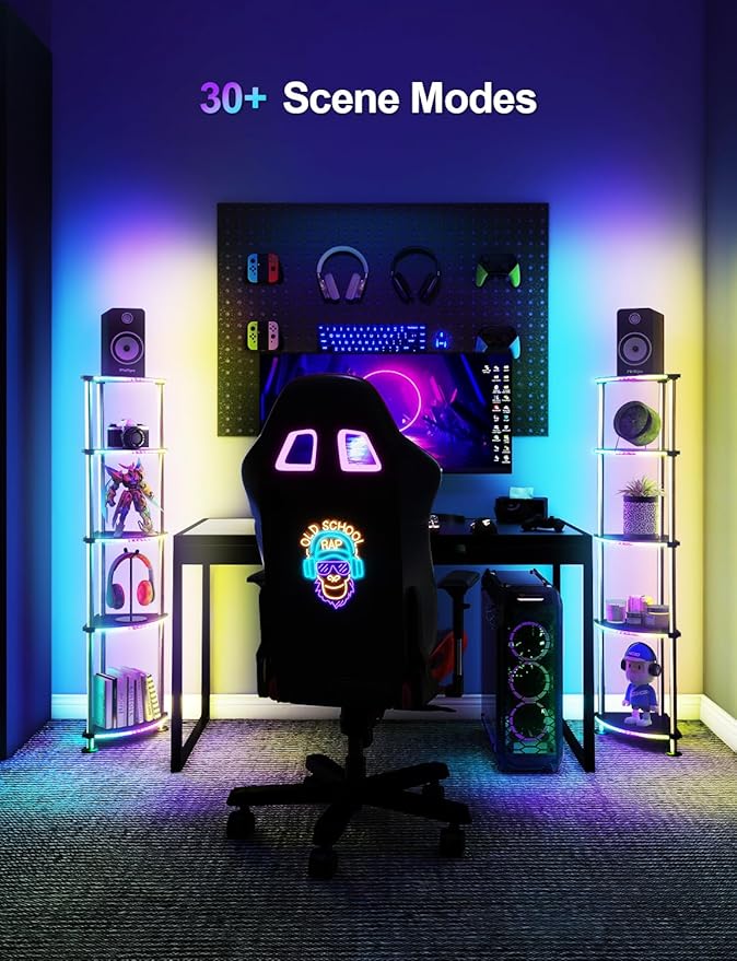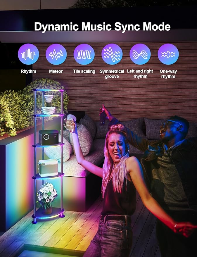 Floor Lamp, Corner Standing Lamp with Shelves, Dimmable Light, Music Sync, Timing, Wireless Charger, and USB Port (Black, 5 Tiers)