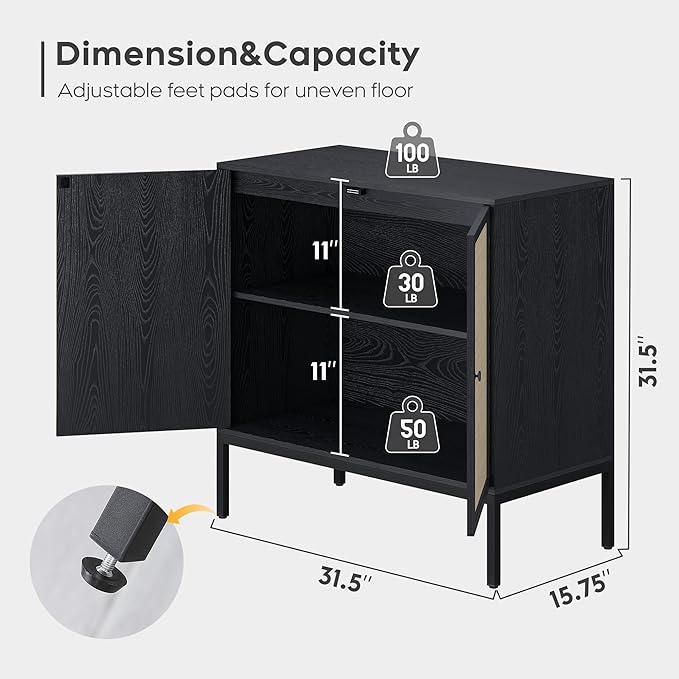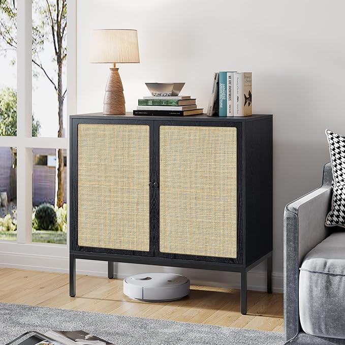 Brafab Set of 2 Rattan Cabinet Buffet Cabinet, Sideboard Cabinet with Natural Rattan Decorated Doors, Accent Cabinet, for Living Room, Entryway, Bedroom, Dining Room/Square Doors, Black