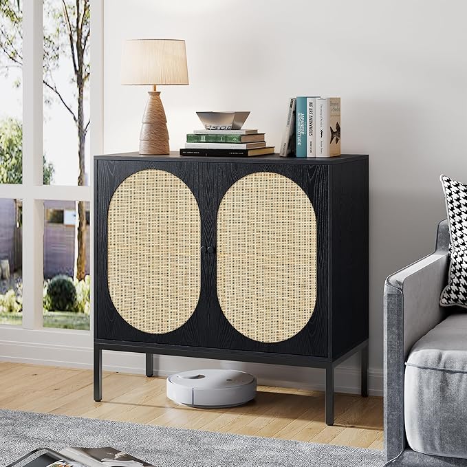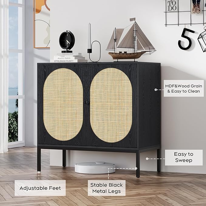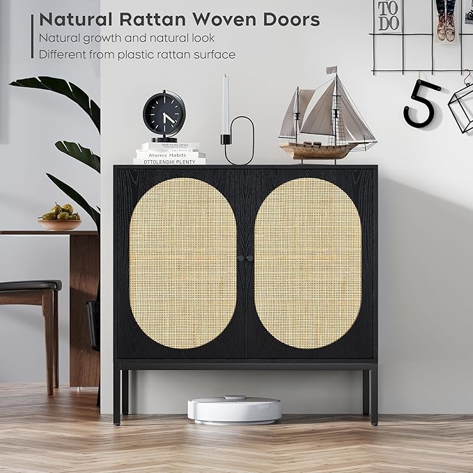 Brafab Rattan Cabinet Buffet Cabinet, Sideboard Cabinet with Natural Rattan Decorated Doors, Accent Cabinet, for Living Room, Entryway, Bedroom, Dining Room/Oval Doors, Black