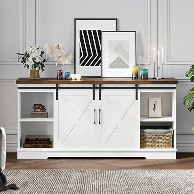 IDEALHOUSE Farmhouse TV Stand, Entertainment Center for 65 Inch TV Media Console Table, White Barn Door TV Stand with Storage and Shelves, Modern TV Console Cabinet Furniture for Living Room