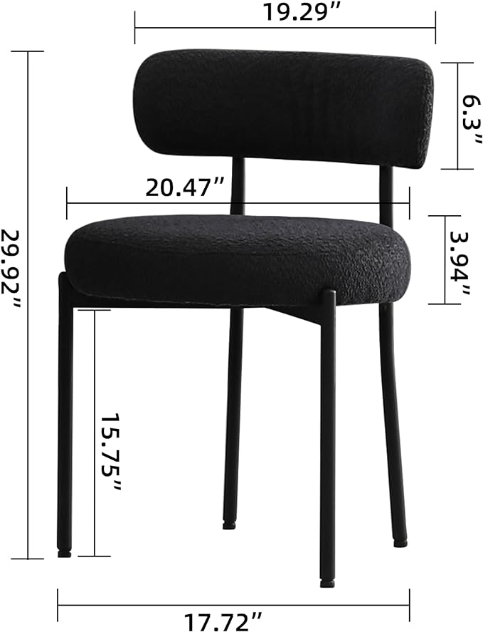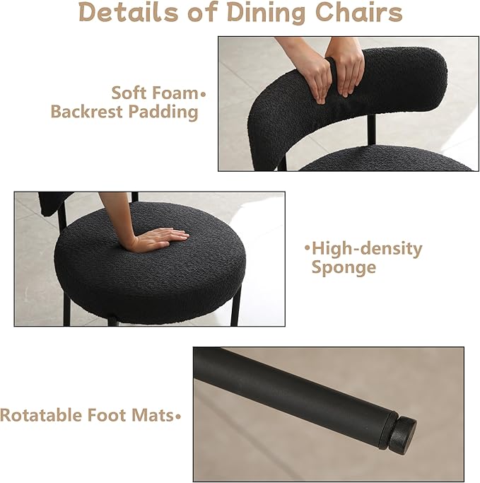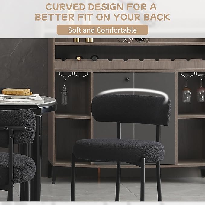 Black Dining Chairs Set of 2 Round Upholstered Boucle Dining Room Chairs Mid-Century Modern Kitchen Chairs Curved Backrest Chairs for Dining Room Black Metal Legs