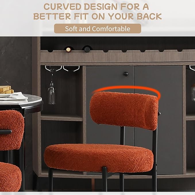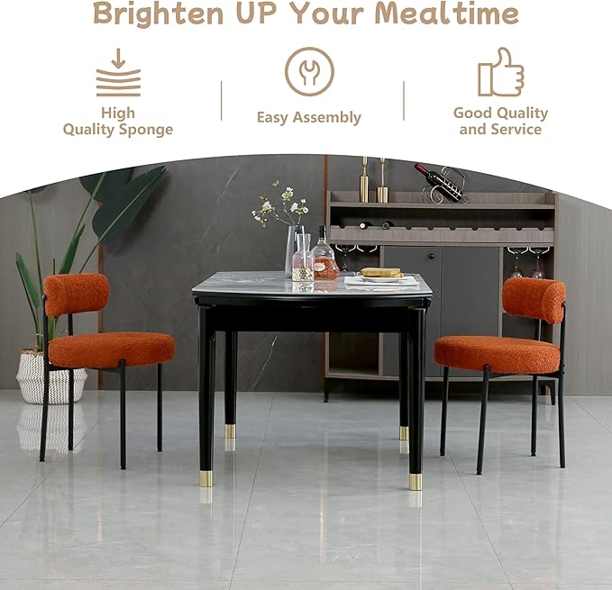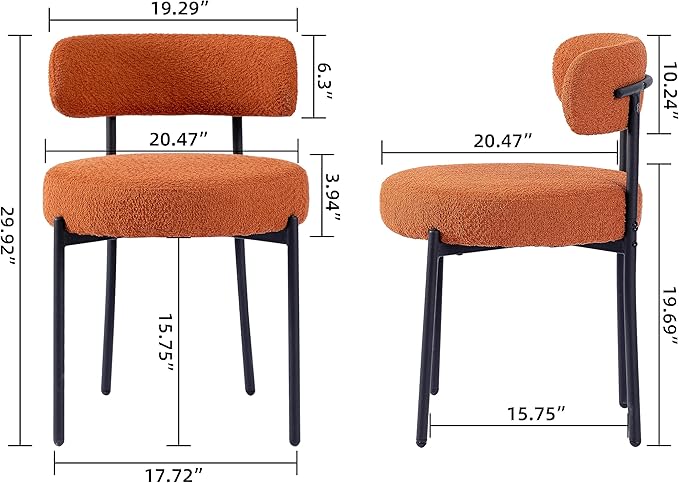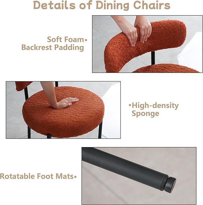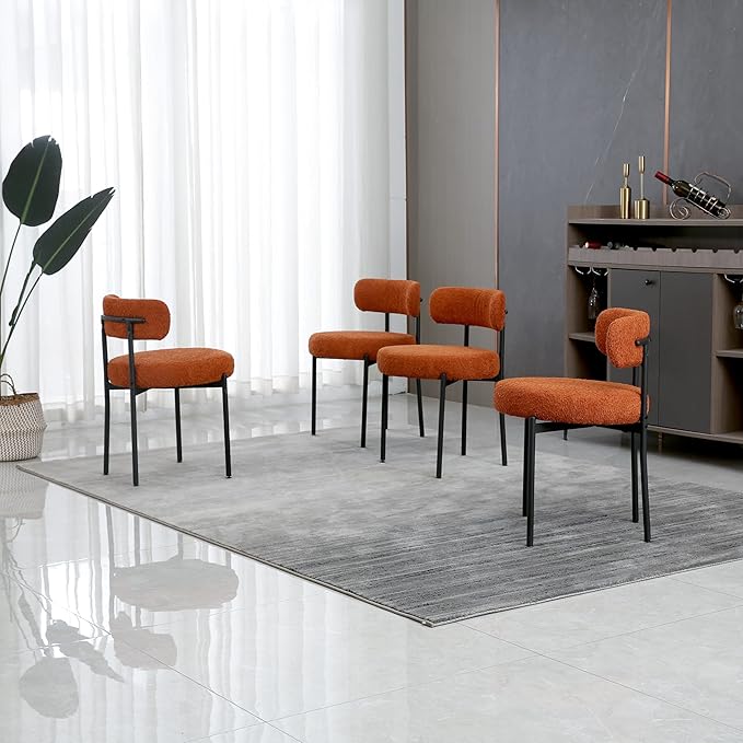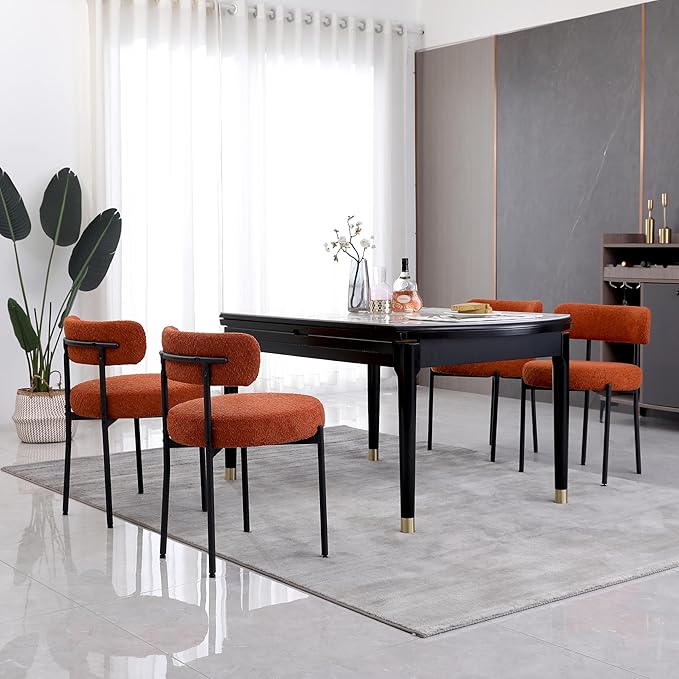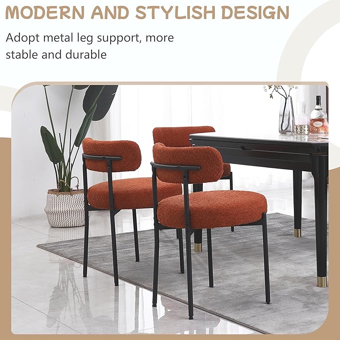 Orange Dining Chairs Set of 4 Round Upholstered Boucle Dining Room Chairs Mid-Century Modern Kitchen Chairs Curved Backrest Chairs for Dining Room Black Metal Legs