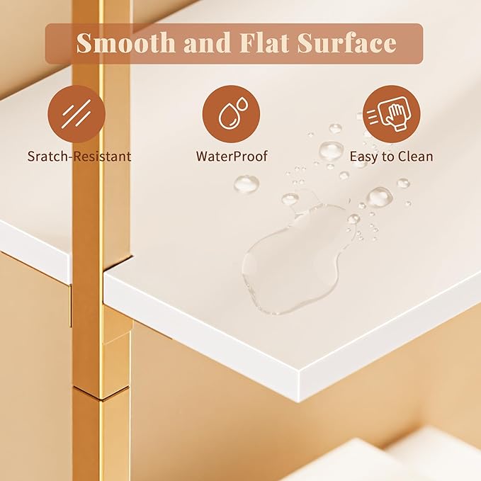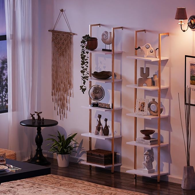 SUPERJARE 5-Tier Bookshelf, Narrow Book Shelf Set of 2, Open Wall-Mounted Ladder Shelf with Metal Frame, Display Bookcase for Home Office, Bedroom, White & Gold