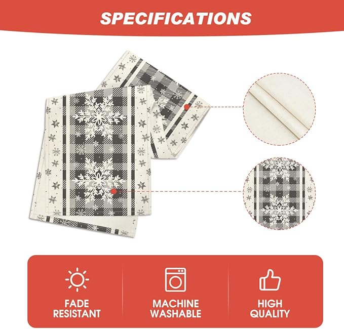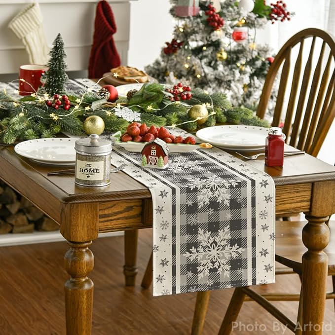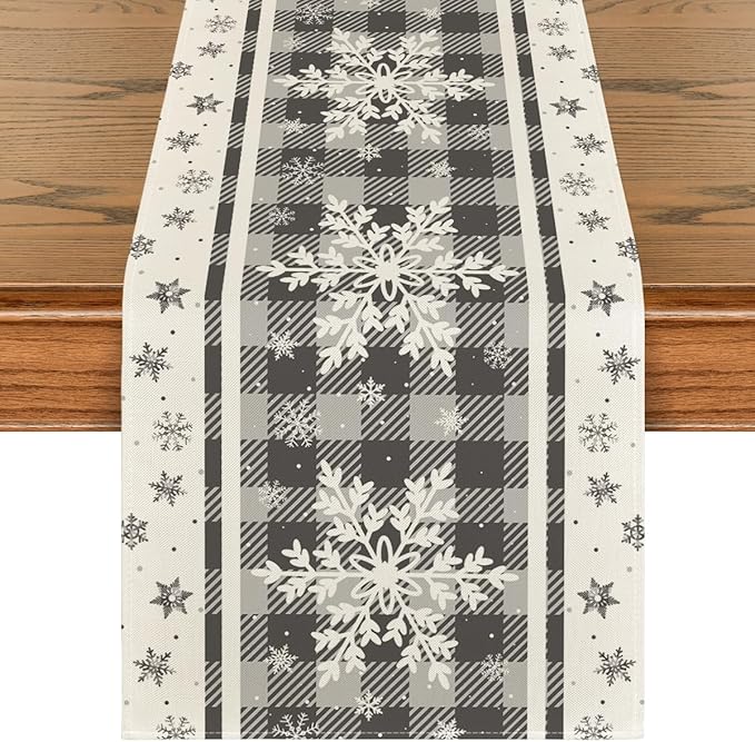 Artoid Mode Grey Buffalo Plaid Snowflakes Christmas Table Runner, Seasonal Winter Kitchen Dining Table Decoration for Home Party Decor 13x72 Inch