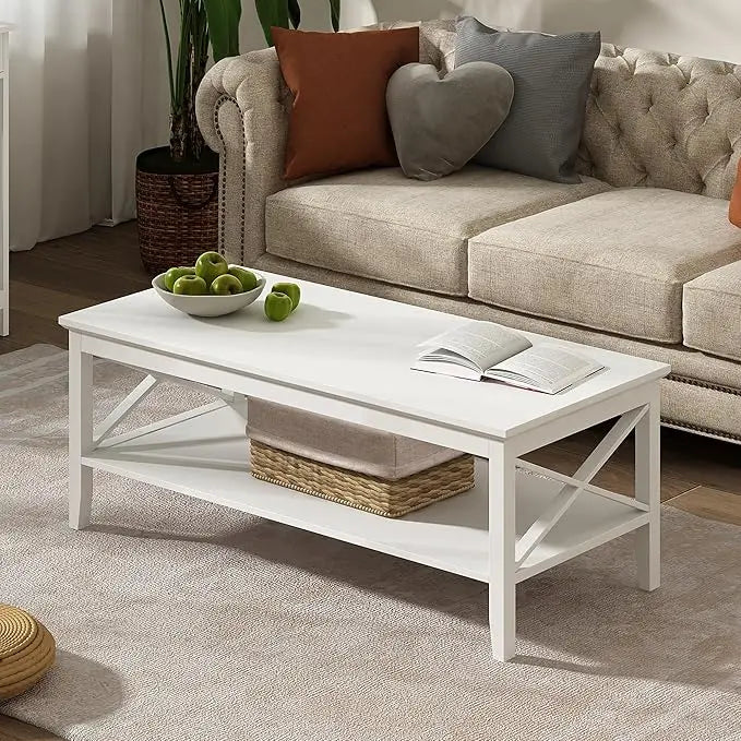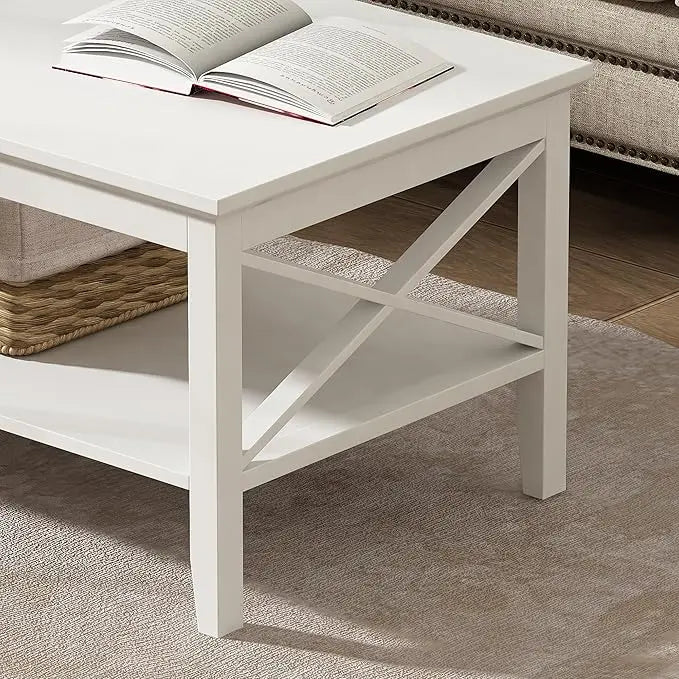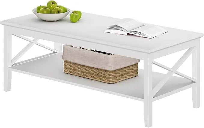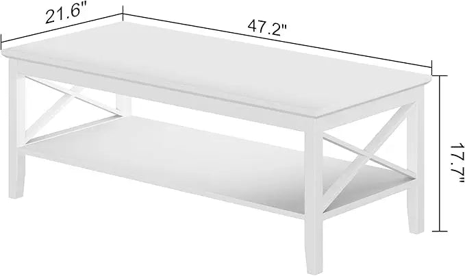 ChooChoo White Coffee Table Classic X Design for Living Room, Rectangular Modern Cocktail Table with Storage Shelf, 47 Inch