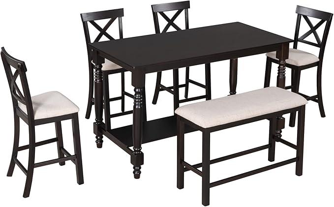 Kitchen 6-Piece Counter Height Set Table with Shelf 4 Chairs and Bench for Dining Room, Espresso