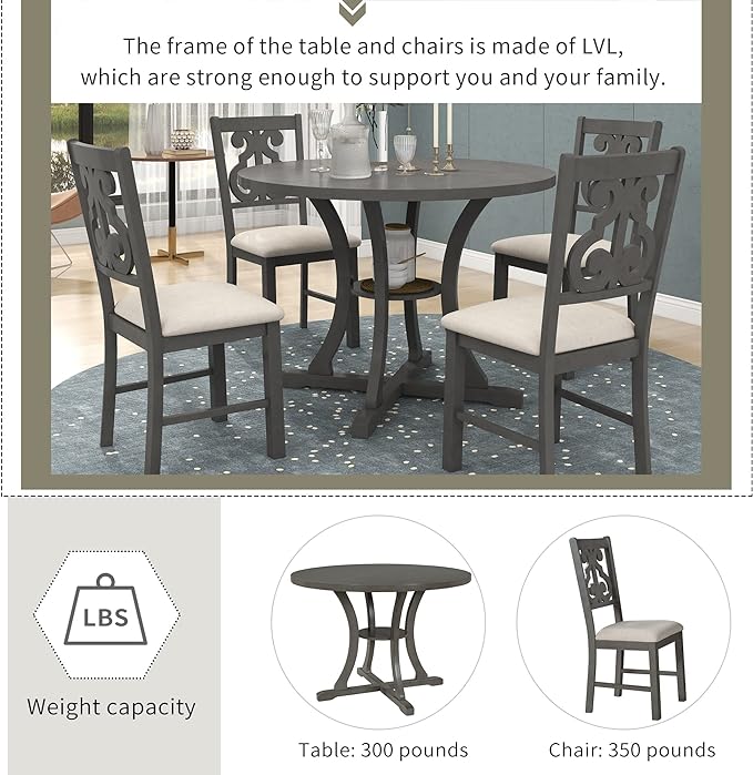 Kitchen 5-Piece Round Table Set with Special-shaped Legs and an Exquisitely Designed Hollow Chair Back for Dining Room, Gray