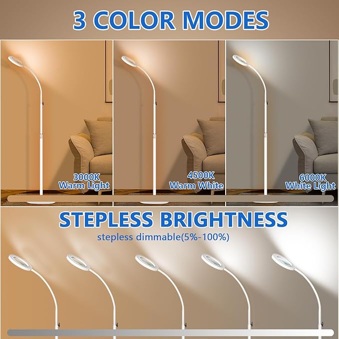 HITTI 10X Magnifying Glass with Light and Clamp, Hands Free Magnifying Floor Lamp with Flexible Gooseneck, 3 Color Stepless Dimmable LED Lighted Magnifier Light Stand for Esthetician Craft Close Works