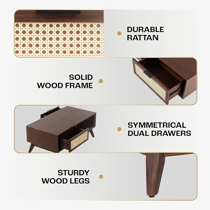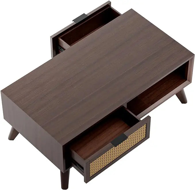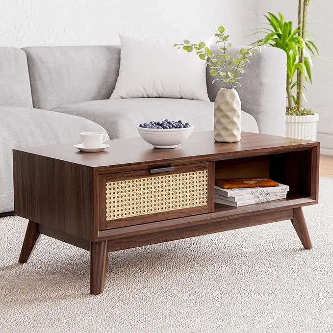Bme Modern Solid Wood Coffee Table with Storage, Accent Rattan Design, Perfect for Living Room, Walnut, Medium