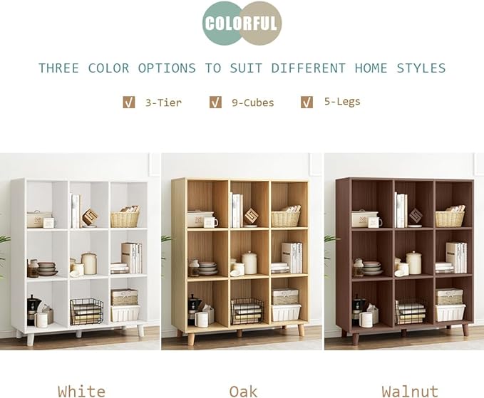 IOTXY Open Cube Low Bookcase - 3-Tier Freestanding Storage Display Cabinet Organizer with Legs for Home Office, 9-Cubes Open Shelf Short Bookshelf, Walnut