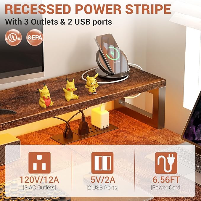 Aheaplus L Shaped Desk with File Drawer, 66" Reversible L Shaped Computer Desk with Power Outlet & LED Strip, Gaming Desk with Monitor Stand, Office Desk Corner Desk with Storage Shelf, Rustic Brown