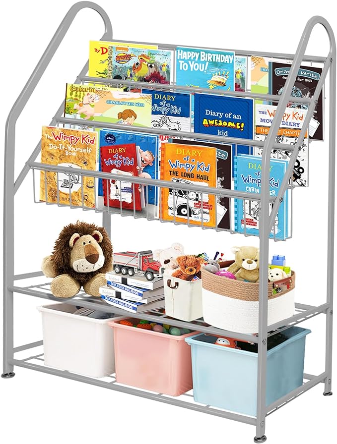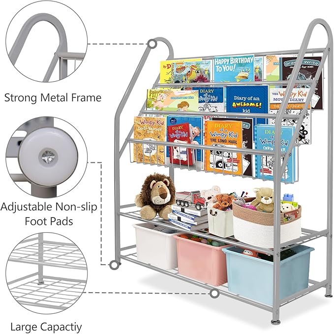 aboxoo Metal Kids Bookshelf Grey Bookcase LargeFreestanding for Children Room 32 in Toy Organizer Large Stable Bookcase Bookstore Library Book Unit Storage Kids Bed Living Room