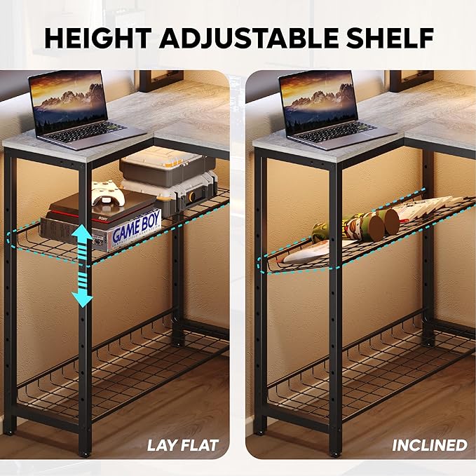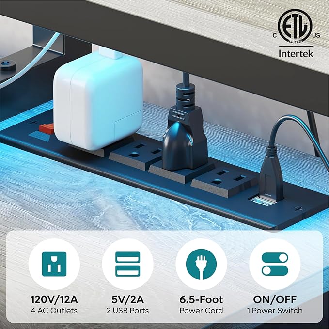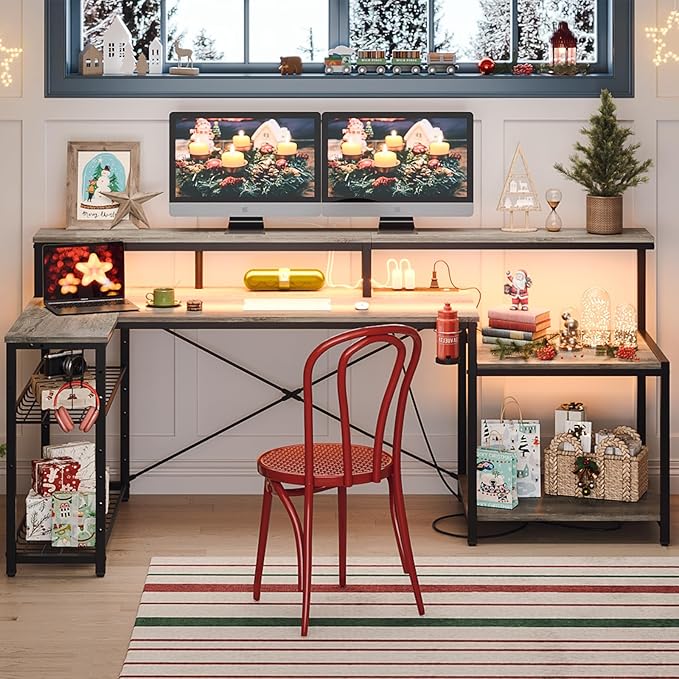 Bestier 71.5 inch Computer Desk with Power Outlets, LED Home Office Desk with Long Monitor Stand, Large Corner Desk with Storage Shelf, Cup Holder & Headset Hooks L Shaped Desk