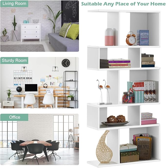 Giantex 5-Tier Geometric Bookshelf White Set of 2, 70'' Tall Wood Freestanding Decorative Display Open Shelves with Anti-Tipping Device, Each Shelf Holds up to 44 lbs, Wooden S Shaped Bookcase