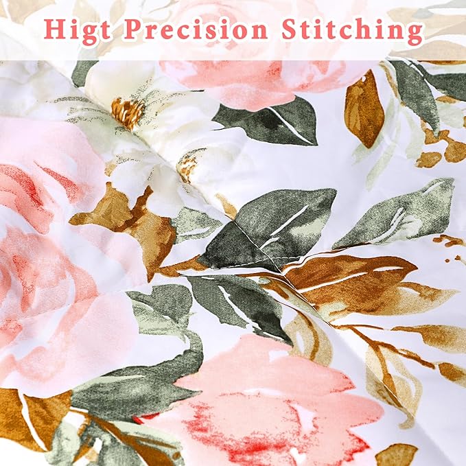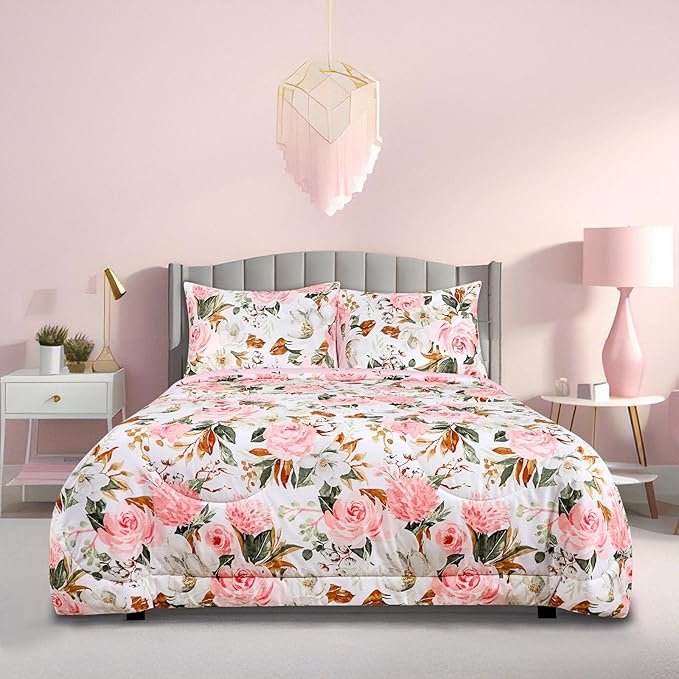 DILIMI Full Size Comforter Set for Girls, Reversible Comforter Full Size, 5 Pieces Ultra Soft Pink Floral Full Size Bed Comforter Sets with Sheet, Comforter, Flat Sheet, 2 Pillowcase
