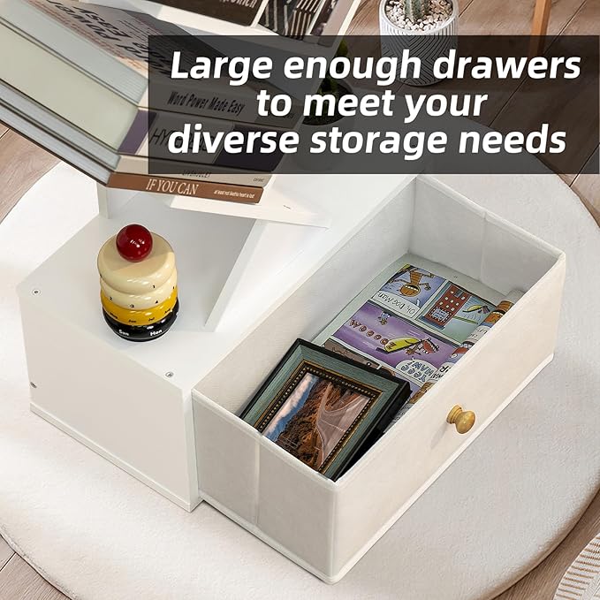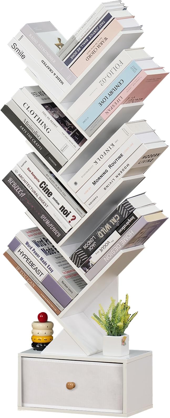 8 Tier Tree Bookshelf with Drawer, Free Standing Wood Bookcase for Living Room, Bedroom, Home Office, Space Saving Storage Organizer Bookshelves for Books, CDs, Vinyl Records- White