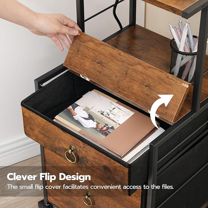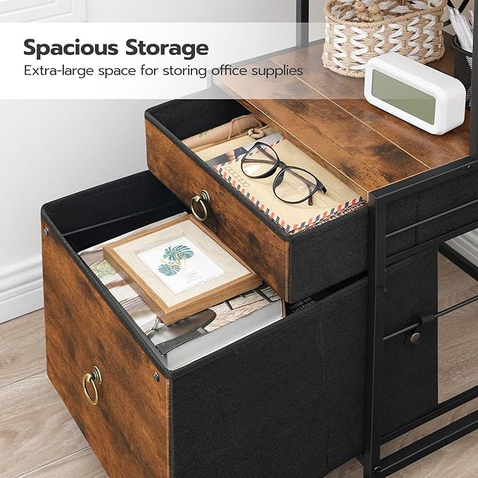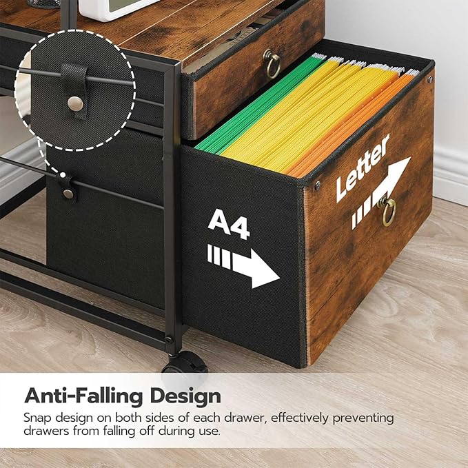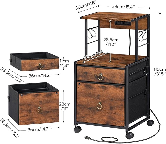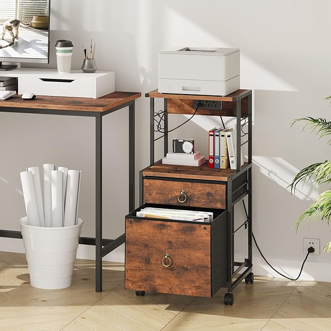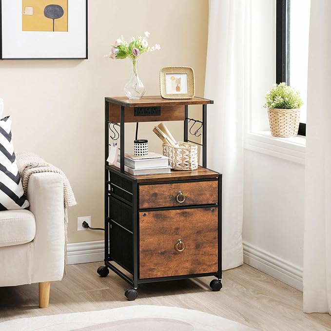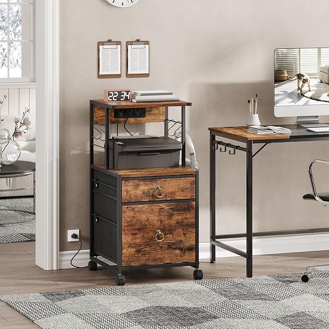 HOOBRO 2-Drawer File Cabinet, Filing Cabinet with Charging Station, Vertical Office Cabinet with Open Storage Shelf, Printer Stand, A4/Letter Size, Nonwovens Drawer, Rustic Brown BF23UWJ01